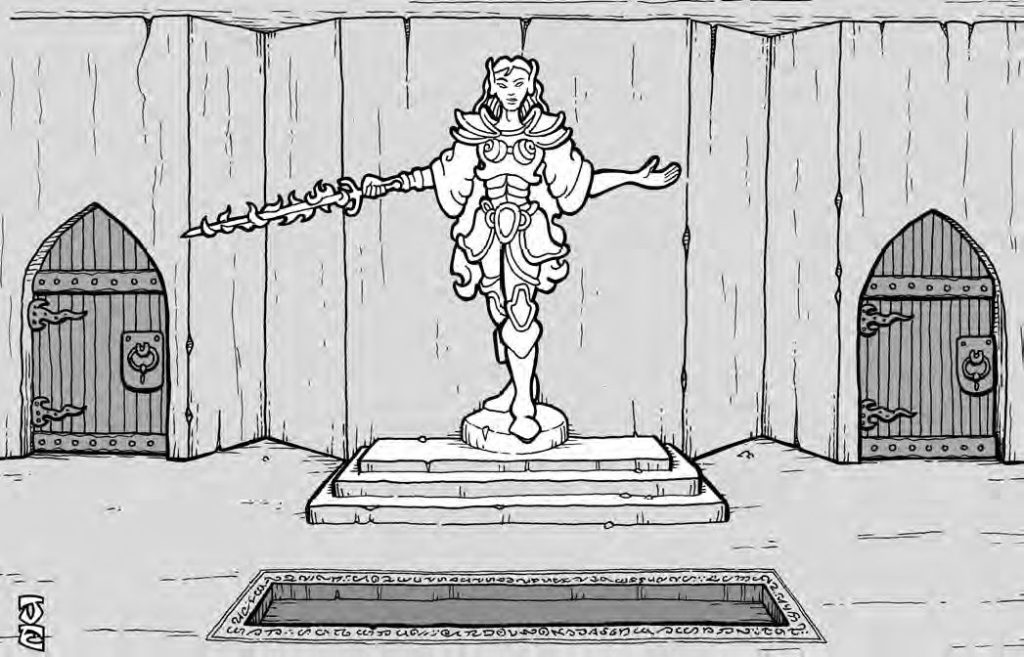 There were two passageways branching off from the entrance but the Strangers found they could only walk down one of the hallways, they could not proceed further down the other. They walked up the one hallway, finding a small room with a basin, then another door which opened up into a large main hall. At the end of the hall there was a statue of Iomedae, with doors going into other rooms.